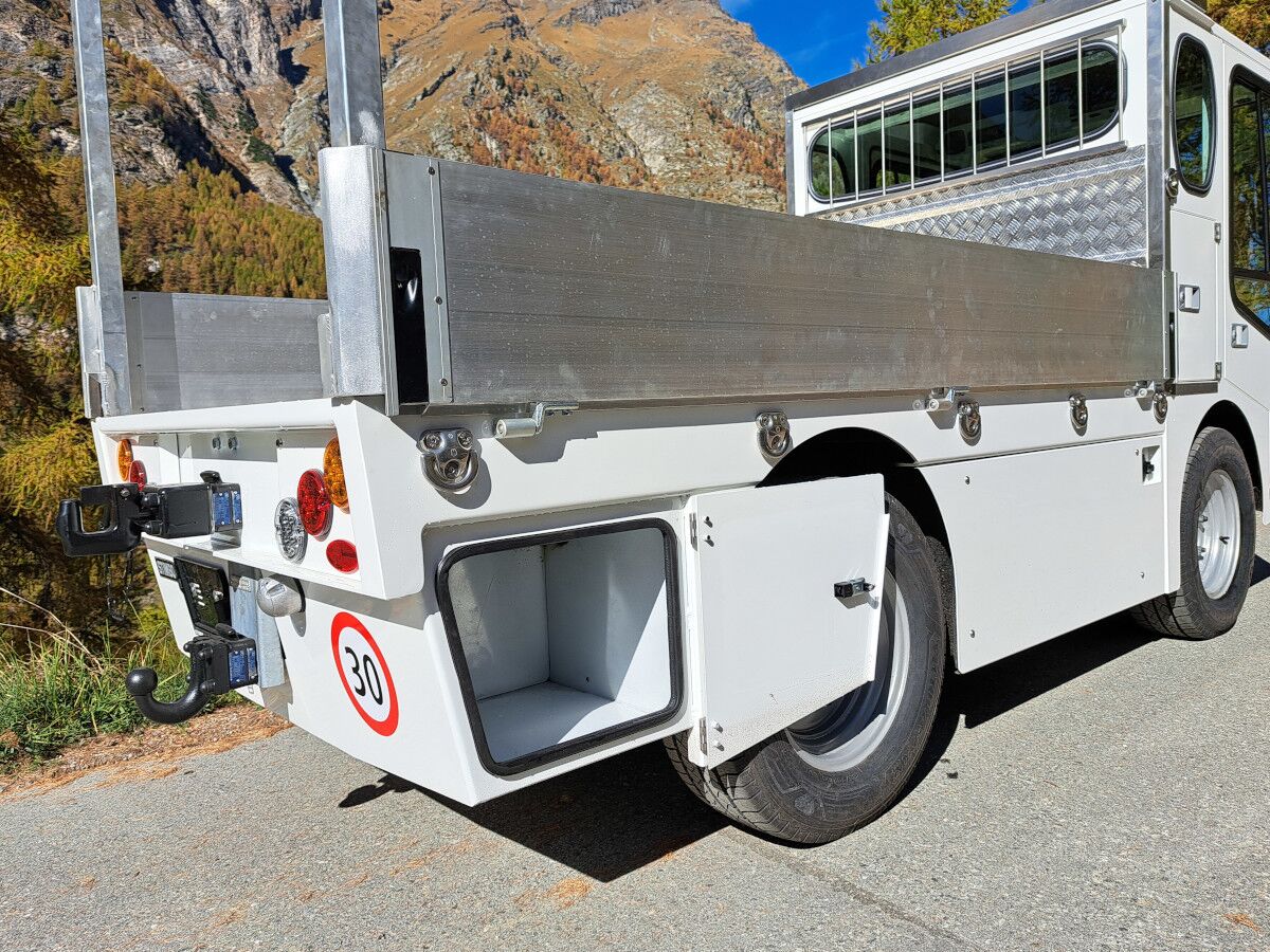 Das Elektrofahrzeug hat 3'000 kg Nutzlast. Rund um die Ladefläche sind rostfreie Bindeösen verteilt, damit die Ladung auch sicher ans Ziel kommt.